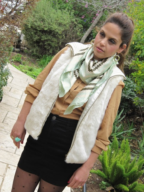 וסט פרווה (היה עם שרוולים סרוגים מצמר שהוסרו על ידי)/ FOREVER 21, חולצה מכופתרת/ קסטרו, חצאית/ קסטרו, צעיף/ קסטרו, גרביונים/ RENUAR, נעליים/ GAZITH, טבעת פרח/FOREVER 21