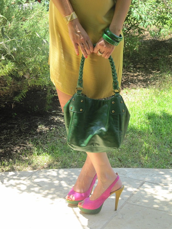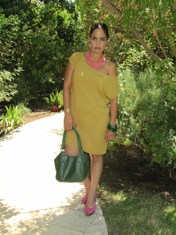 שמלה/ KOOI עפולה, נעליים/ scoop עפולה, תיק/ גולף, צמידים ירוקים/ MANGO, צמיד גורמט מלופף, שרשרת ועגילים/ ג'וסיס.
